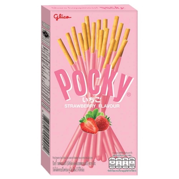 POCKY Ingredientes: Harina de TRIGO, manteca de cacao (manteca de cacao, azúcar, almidón, emulsionantes (E322, E475)), azúcar, aceite hidrogenado comestible, aromas, fresa en polvo 1%, aceite vegetal, anti-aglomerante E500ii, acidulantes E296, emulsionantes (E322, E473), sal, levadura.